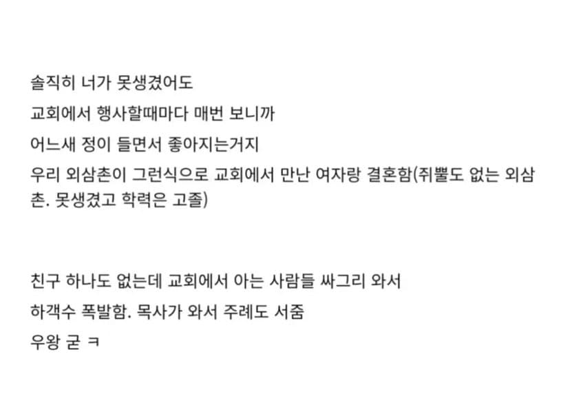 자유게시판 자유글 () 여자만나려고 교회가는 개독남 익명90104 2025.03.25 - 17:10 2025.03.25 - 17:10 개독 = 저능아 수용소 추천 1 신고 Attached file 95d54e11a086260a21590b51a2dbcd15.jpg 50.2KB 444a17eea0f04d7d600849f75a96b12c0.jpg 60.6KB 478f57b33042c186c0da7a405f6861bf3.jpg 21.1KB 3 이 게시물을.. 댓글3 0 익명90104 2025.03.25 - 17:10 #14279 비회원은 댓글을 읽을 수 없습니다 댓글 0 익명90104 2025.03.25 - 17:10 #14282 비회원은 댓글을 읽을 수 없습니다 댓글 0 익명90104 2025.03.25 - 17:10 #14285 비회원은 댓글을 읽을 수 없습니다 댓글 댓글 입력 에디터 전환 글쓴이 비밀번호 댓글 등록 댓글 쓰기 에디터 사용하기 닫기 글쓴이 비밀번호 댓글 등록 view_headline 목록 14px 이제, 종교를 그 본래의 자리로 되돌려 놓아야하지 않을까요? 목록 view_headline 3 × CLOSE - KEEP CLOSED 전체 자유글 3705 경험담 636 컬럼 34 비판 12 뉴스 4 기본 (4,412) 제목 날짜 수정 조회 댓글 추천 비추 제목+내용제목내용댓글닉네임등록일태그 분류 정렬 검색 📌 정체성과 운영방향 및 레벨 등급 1 2025.07.07 - 19:32 1994 1 번호 분류 제목 글쓴이 날짜 조회 수 추천 수 4412 자유글 조곤조곤TV 시사대담 제1회 - "극우주의와 기독교" 1부 역사학자 전우용 교수 N 미역국먹다깨달음 7시간 전 78 0 4411 자유글 서울 한복판에 이런 곳이? | 일하고 싶지만 일자리가 없다 | 자원봉사하는 노숙인 | 용산역 텐트촌 거주자들 | EBS다큐 2 냥냥펀치2000 2025.10.03 540 6 4410 자유글 박정희 시리즈 4 2 개독 2025.10.03 540 0 4409 자유글 한국 우파가 '봉준호'와 '한강'을 인정 못하는 진짜 이유 2 아멘하면현금나옴? 2025.10.03 533 0 4408 자유글 [주간 처치독] 2025 교단 총회 결산(1/2) - 여자는 목사하지 마라 2025.10.03 1 아멘하면현금나옴? 2025.10.03 550 0 4407 자유글 "내 밑으로 다 집합!" 트럼프와 국방장관, 장군들에게 무슨 얘기? / SBS / 편상욱의 뉴스브리핑 2 교회카페마진30퍼실화냐 2025.10.03 598 0 4406 자유글 "휴대전화 두고 흡연장에서…" 국가전산망 장애 담당 공무원 세종청사서 투신 냥냥펀치2000 2025.10.03 587 0 4405 자유글 철학자가 해설하는 가장 좋았던 국무회의. 서민들 괴롭히는 검찰 기소 #국가괴롭힘 #검찰기소 #이재명대통령 #국무회의생중계 #철학박구용 #겸손은힘들다 #온뉴스 교회카페마진30퍼실화냐 2025.10.03 558 0 4404 자유글 대가리 꽃밭 망상증 정신병자들은 교회를 다닌다. 개독냄새 2025.10.03 621 0 4403 자유글 교회가지마...정신병걸려 1 뚜루뚜루 2025.10.01 1077 0 4402 자유글 특별법 제정부터 길거리 포교 금지까지? 해외의 종교 범죄 대응법 탈탈 털어봄 2 냥냥펀치2000 2025.10.01 1134 0 4401 자유글 사실 교회 안에서 겉보기에는 정통(正統)인데, 실제로 따지고 보면 이단 신앙인 패턴을 알아보자 개독냄새 2025.09.30 1393 0 4400 자유글 천국 미끼 노동착취: 교회판 가스라이팅 알바 시스템 교회쟁이사절 2025.09.24 2928 0 4399 자유글 천국을 미끼로 한 교회신도 노동 착취 시스템 개독냄새 2025.09.24 2877 0 4398 자유글 오래 다닐수록 더 개독이 되는 이유 1 목사님의탈세특강 2025.09.24 2949 0 4397 자유글 [주간 처치독] 인구 소멸 위험 지역서 살아가는 교회들 2025.06.13 퍼킹예수 2025.09.22 3327 0 4396 자유글 예장합동 "목사는 남성만, 여성은 강도사까지만 목사탈세 2025.09.22 3397 13 4395 자유글 정통기독교에서 말하는 이단.사이비로 찍히지 않는 방법 미역국먹다깨달음 2025.09.22 3301 0 4394 컬럼 이제, 종교를 그 본래의 자리로 되돌려 놓아야하지 않을까요? 퍼킹예수 2025.09.20 3656 0 4393 자유글 근본을 제시하는 것은 옳지만, 근본주의가 되어서는 안 된다 목사탈세 2025.09.19 3897 0 1 2 3 4 5 6 7 8 9 10 .. 221 / 221 GO 글쓰기
