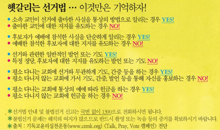 많은 교회들이 교인들에게 교회내에서 정치적인 이야기를 하지 말라고 요구할 것이 아니라, 올바른 정치에 대한 기독교적 가치관과 행동을 교육시켜야 한다. 불의에 대한 침묵과 비겁함을 ‘경건함과 신앙적 성숙함으로 포장’하는 문화가 기승을 부리는 한국교회의 상황에서는 더욱 올바른 정치 교육이 절실하다. 지지하는 정당이 다르고 지지하는 정치인이 다르고, 어떤 이슈에 대해 바라보는 관점이 다를지라도 서로를 존중하고 인격을 무시하지 않으며, 현안에 대한 토론과 논쟁이 가능한 문화를 교회에서 교육시키고 만들어줘야 한다.