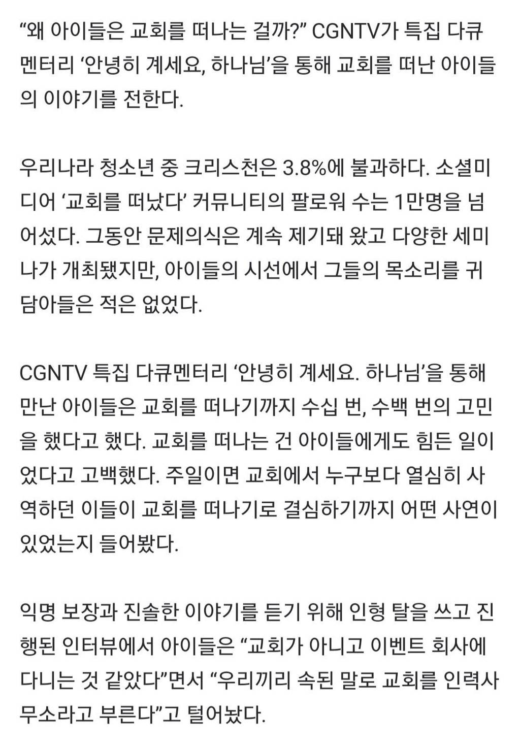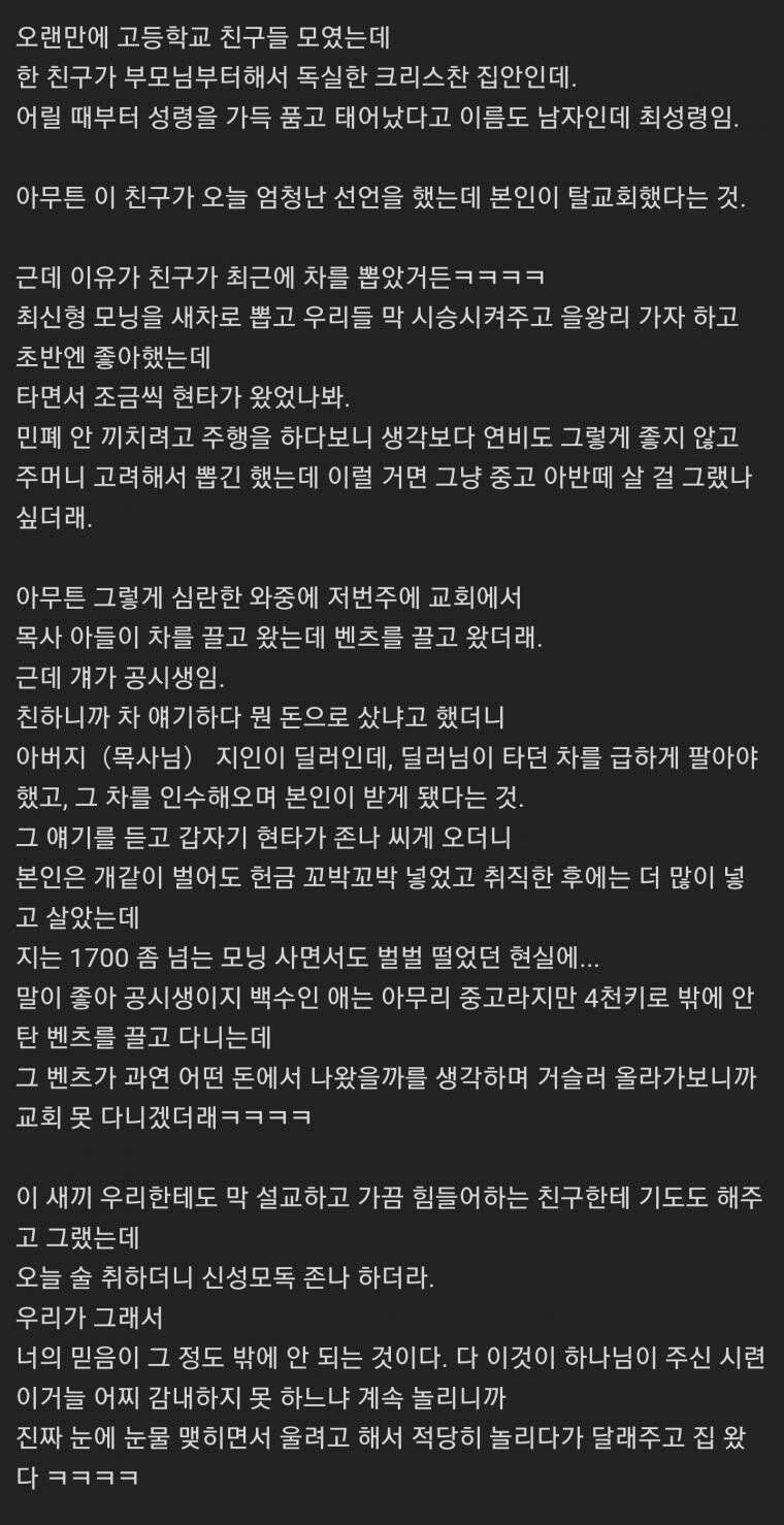 자유게시판 자유글 () 한국 청소년들의 탈주가 심각하다는 종교 무명의덕 2024.12.14 - 13:52 미국유학때 부모님 목사님인 애들 하도 많아서 저긴 단체로 오나보다 했다. 그리고 하는 거 보면 그 돈 어디서 왔을까 추천 0 신고 Attached file aFzDhm.jpg 96.3KB 9RgOuXJ.jpg 182.9KB 8rhSpCW.jpg 156.6KB 8 이 게시물을.. 0 무명의덕 다음 레벨 90 - 총 획득 0 ( 필요 90 = 획득 0 + 남음 90 | 0%) 무명의덕 님의 최근 글 작성 글이 없습니다. 무명의덕 님의 최근 댓글 작성 댓글이 없습니다. 글쓴이의 서명작성글 감추기 댓글2 0 무명의덕 2024.12.14 - 13:52 #3130 비회원은 댓글을 읽을 수 없습니다 댓글 수정 삭제 0 무명의덕 2024.12.14 - 13:53 #3131 비회원은 댓글을 읽을 수 없습니다 댓글 수정 삭제 댓글 입력 에디터 전환 글쓴이 비밀번호 댓글 등록 댓글 쓰기 에디터 사용하기 닫기 글쓴이 비밀번호 댓글 등록 view_headline 목록 수정 삭제 14px 이제, 종교를 그 본래의 자리로 되돌려 놓아야하지 않을까요? 목록 view_headline 쓰기 수정 삭제 2 × CLOSE - KEEP CLOSED 전체 자유글 3705 경험담 636 컬럼 34 비판 12 뉴스 4 기본 (4,412) 제목 날짜 수정 조회 댓글 추천 비추 제목+내용제목내용댓글닉네임등록일태그 분류 정렬 검색 📌 정체성과 운영방향 및 레벨 등급 1 2025.07.07 - 19:32 1994 1 번호 분류 제목 글쓴이 날짜 조회 수 추천 수 4412 자유글 조곤조곤TV 시사대담 제1회 - "극우주의와 기독교" 1부 역사학자 전우용 교수 N 미역국먹다깨달음 5시간 전 60 0 4411 자유글 서울 한복판에 이런 곳이? | 일하고 싶지만 일자리가 없다 | 자원봉사하는 노숙인 | 용산역 텐트촌 거주자들 | EBS다큐 2 냥냥펀치2000 2025.10.03 517 6 4410 자유글 박정희 시리즈 4 2 개독 2025.10.03 520 0 4409 자유글 한국 우파가 '봉준호'와 '한강'을 인정 못하는 진짜 이유 2 아멘하면현금나옴? 2025.10.03 511 0 4408 자유글 [주간 처치독] 2025 교단 총회 결산(1/2) - 여자는 목사하지 마라 2025.10.03 1 아멘하면현금나옴? 2025.10.03 527 0 4407 자유글 "내 밑으로 다 집합!" 트럼프와 국방장관, 장군들에게 무슨 얘기? / SBS / 편상욱의 뉴스브리핑 2 교회카페마진30퍼실화냐 2025.10.03 580 0 4406 자유글 "휴대전화 두고 흡연장에서…" 국가전산망 장애 담당 공무원 세종청사서 투신 냥냥펀치2000 2025.10.03 565 0 4405 자유글 철학자가 해설하는 가장 좋았던 국무회의. 서민들 괴롭히는 검찰 기소 #국가괴롭힘 #검찰기소 #이재명대통령 #국무회의생중계 #철학박구용 #겸손은힘들다 #온뉴스 교회카페마진30퍼실화냐 2025.10.03 539 0 4404 자유글 대가리 꽃밭 망상증 정신병자들은 교회를 다닌다. 개독냄새 2025.10.03 599 0 4403 자유글 교회가지마...정신병걸려 1 뚜루뚜루 2025.10.01 1059 0 4402 자유글 특별법 제정부터 길거리 포교 금지까지? 해외의 종교 범죄 대응법 탈탈 털어봄 2 냥냥펀치2000 2025.10.01 1116 0 4401 자유글 사실 교회 안에서 겉보기에는 정통(正統)인데, 실제로 따지고 보면 이단 신앙인 패턴을 알아보자 개독냄새 2025.09.30 1374 0 4400 자유글 천국 미끼 노동착취: 교회판 가스라이팅 알바 시스템 교회쟁이사절 2025.09.24 2911 0 4399 자유글 천국을 미끼로 한 교회신도 노동 착취 시스템 개독냄새 2025.09.24 2856 0 4398 자유글 오래 다닐수록 더 개독이 되는 이유 1 목사님의탈세특강 2025.09.24 2922 0 4397 자유글 [주간 처치독] 인구 소멸 위험 지역서 살아가는 교회들 2025.06.13 퍼킹예수 2025.09.22 3309 0 4396 자유글 예장합동 "목사는 남성만, 여성은 강도사까지만 목사탈세 2025.09.22 3376 13 4395 자유글 정통기독교에서 말하는 이단.사이비로 찍히지 않는 방법 미역국먹다깨달음 2025.09.22 3279 0 4394 컬럼 이제, 종교를 그 본래의 자리로 되돌려 놓아야하지 않을까요? 퍼킹예수 2025.09.20 3636 0 4393 자유글 근본을 제시하는 것은 옳지만, 근본주의가 되어서는 안 된다 목사탈세 2025.09.19 3881 0 1 2 3 4 5 6 7 8 9 10 .. 221 / 221 GO 글쓰기