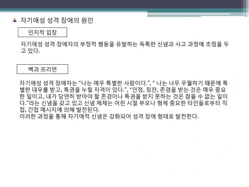- 자존감 부족으로 인한 자의식 과잉으로 현실 판단에 대한 인식이 자신의 바람인 경우가 많음. 스스로를 대단하다고 생각함