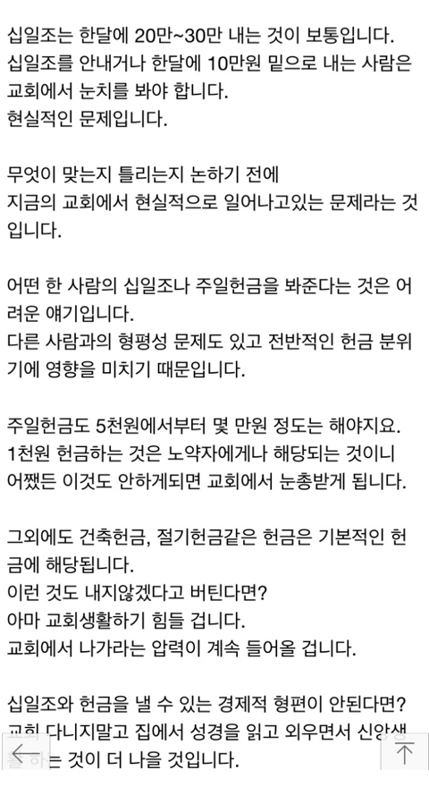 엥 답변 무슨 헛소리야ㅋㅋㅋㅋ 십일조 강요하는 교회가 이상한거지;; 무슨 교회가 다 저러는 줄 알아ㅋㅋ십일조 자체가 본인이 번 돈에서 십의 일조를 내는 건데 우리교회는 십일조 얼마 이상 내라고 강요하지도 않고 헌금 지불하는 거에 대해서 감놔라 배놔라 안 해 그리고 봉투에 이름 쓰는 거 누가 얼마냈나 확인하려고 쓰는게 아니라 나중에 연말정산 때 기부금 영수증 발급 때문에 쓰는거임...ㅋ